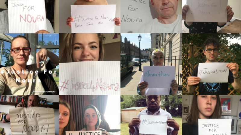 Ich bitte Sie, auf Twitter und Facebook ein Foto von Ihnen mit dem Hashtag #JusticeForNoura zu teilen.
