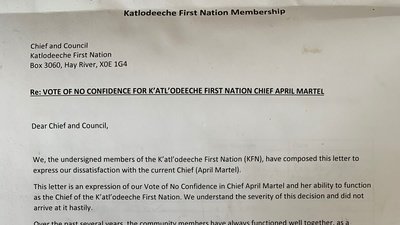 Re: VOTE OF NO CONFIDENCE FOR K’ATL’ODEECHE FIRST NATION CHIEF APRIL MARTEL