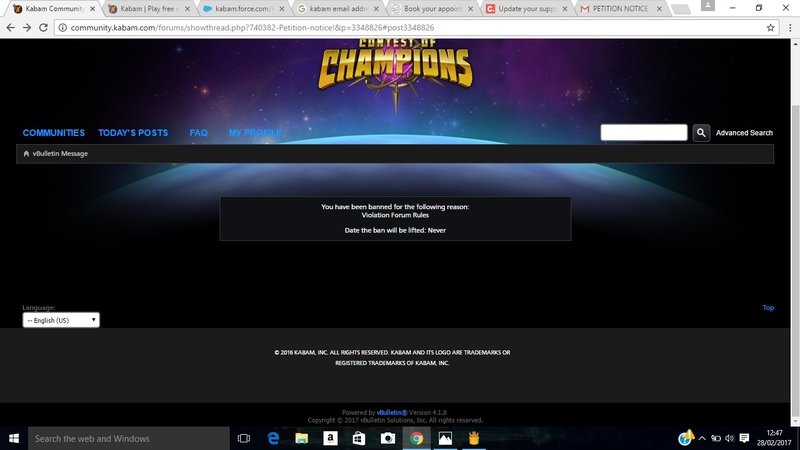 So after that automated response from Kabam, I decided to send KabamMike a PM. I got totally ignored so decided to post in forums. I was banned pretty sharpish as expected.