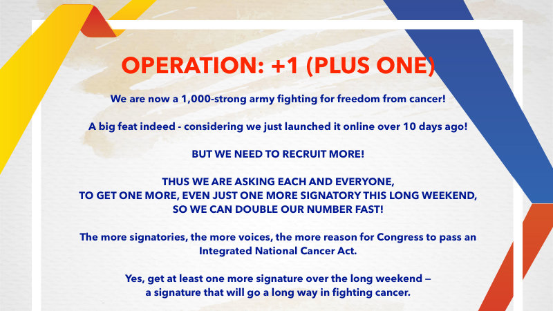 Petition updateKALAYAAN MULA SA KANSER : PASS A NATIONAL INTEGRATED CANCER CONTROL ACT NOW!OPERATION: PLUS ONE IS ON!