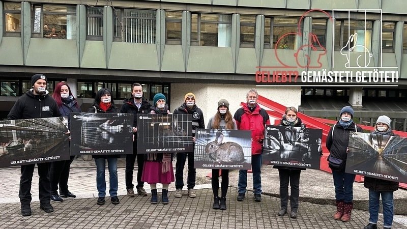 Vor der Verhandlung haben wir demonstriert und dabei auch Bilder aus der Kaninchenzucht gezeigt. Wir sind nach wie vor der Meinung: Wir müssen benennen dürfen, wo die Tierquälerei stattfindet!