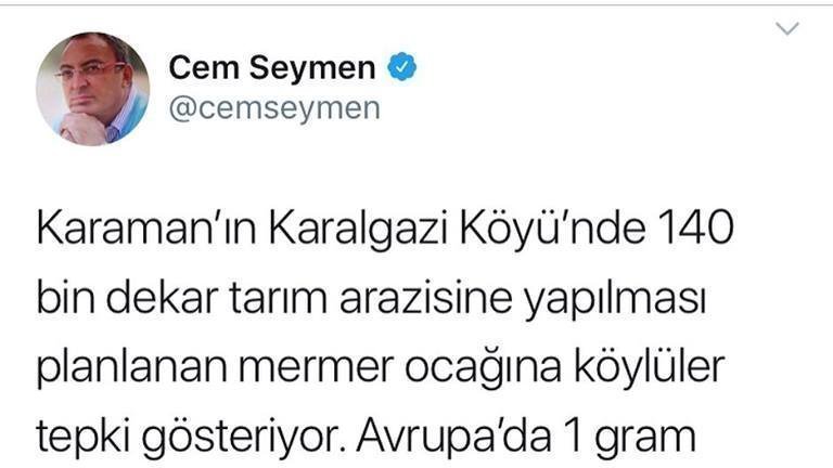 CNN de Para Dedektifi programını sunan Cem Seymen ve Tiyatro oyuncusu Orhan Aydın'dan Karaman Karalgazi Köyünde gündemde olan mermer ocaklarına karşı tepkileri geçikmedi. Attıkları twitlerle köylülerin yanında olduklarını gösterdiler.