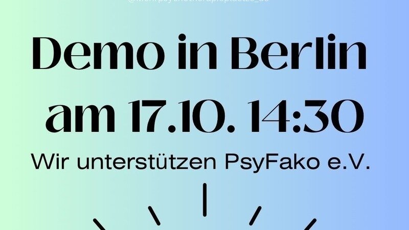 am 17. Oktober 2023 um 14:30 Uhr findet eine von PsyFako organisierte Demonstration für bedarfsgerechte psychotherapeutische Versorgung in Berlin statt. Das Organisationsteam und wir als Unterstützer*innen setzen uns für eine verbesserte psychotherapeutische Versorgung ein.