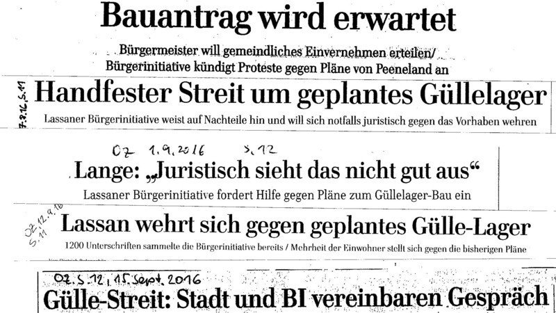An den Schlagzeilen der Lokalpresse lässt sich die Entwicklung im Streit um das Güllegroßlager ablesen. Dank des öffentlichen Drucks, auch Eurer vielen Stimmen für die Petition, gibt es erste zarte Signale von Seiten der Stadt Lassan, mit der BI in Dialog zu treten. Auch die Peeneland Agrar GmbH hat jetzt erstmals Gesprächsbereitschaft angekündigt..., trotzdem sollten wir nicht nachlassen und die öffentliche Diskussion zur Verhinderung des Güllegroßlager im Lassaner Winkels in Gang halten. Bitte verbreitet weiterhin unsere Petition per Mail, Facebook usw. Jede Stimme macht uns Mut, stärkt und bestätigt uns.