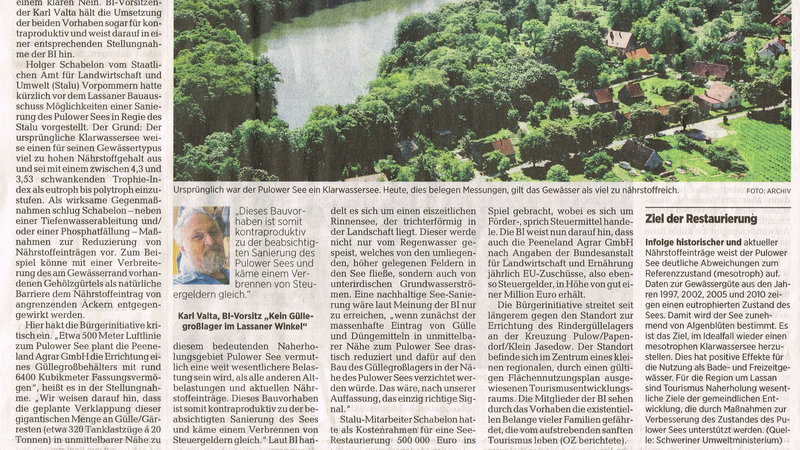 Ist eine Restaurierung des Pulower Sees sinnvoll, wenn nur 500m entfernt ein gigantisches Rindergüllelager gebaut wird, dessen Inhalt später unter anderem auf die Äcker rings um den See ausgebracht werden soll? Lesen Sie die Stellungnahme der BI-KEIN GÜLLEGROSSLAGER IM LASSANER WINKEL: