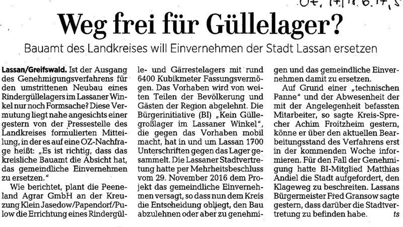 Trotz vieler positiver Signale in der letzten Zeit, wie die geplante Ansiedlung einer anthroposophischen Kurklinik und den Tourismus-preis für die Peeneregion, will der Kreis den gesellschaftlich verantwortungslosen Kurs der Peeneland Agrar GmbH unterstützen, gegen den Willen der Bevölkerung und ihrer gewählten Vertreter!