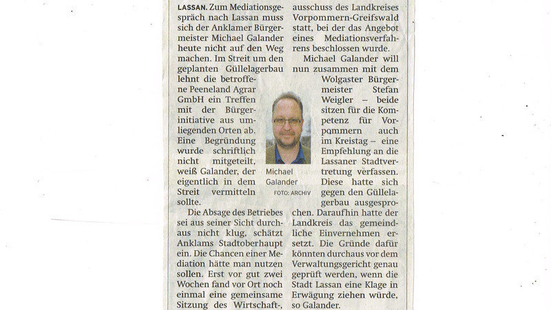 Die BI bedauert die Haltung der Peeneland Agrar GmbH - Eigner. Eine wertvolle Chance für eine einvernehmliche Lösung des Konflikts wurde verspielt. ( siehe Presseerklärung von Anklams Bürgermeister Michael Galander, NK vom 15.8.17, S. 15 )