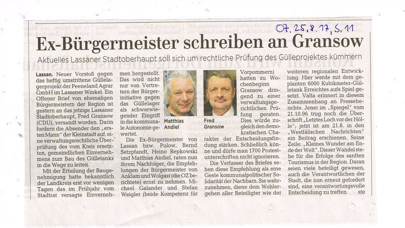 Nachdem schon die Bürgermeister der Nachbarstädte Anklam und Wolgast in einer Geste kommunalpolitischer Solidarität dem jetzigen Bürgermeister von Lassan dringend zu einer Klage gegen die Baugenehmigung eines Großgüllelagers geraten haben, melden sich nun weitere 3 ehemalige Bürgermeister von Lassan zu Wort und empfehlen auch eine verwaltungsrechtlichen Prüfung. ( siehe OZ - Artikel ! )