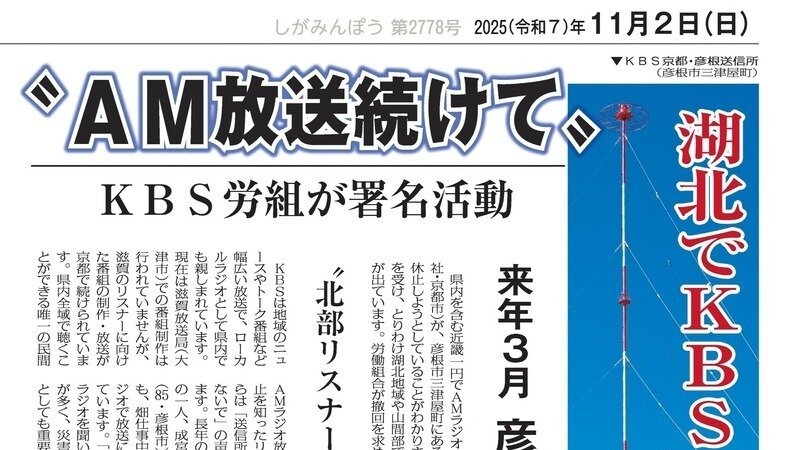 滋賀の地元紙「滋賀民報」の1面に彦根送信所休止反対署名活動の取り組みが紹介されました。「『しがみんぽう』を見た。KBSラジオが聞こえなくなるのは困る」と彦根から多くの署名が届き、オンライン署名と合わせて300筆を超え、まもなく400筆。