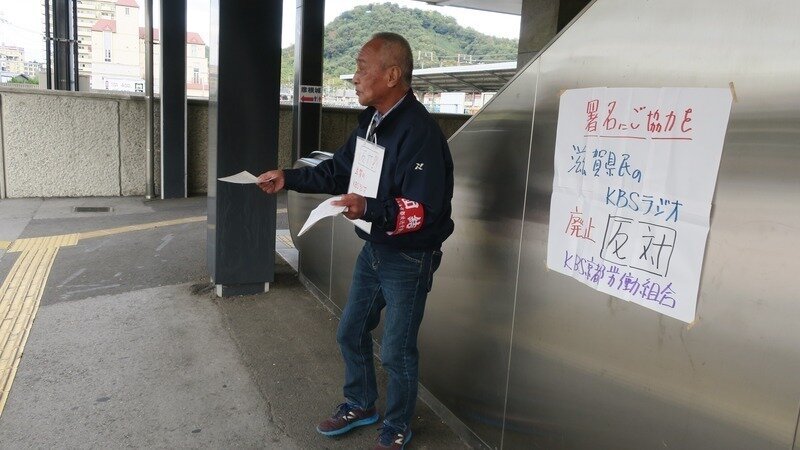 彦根送信所のおひざ元、彦根城近くのJR彦根駅前でビラ配布と署名活動を行いました。「知らなかった」「聞けなくなるのは困る」と署名用紙にペンを走らせて下さいました。ビラも多くの人に受けとって頂きました。
