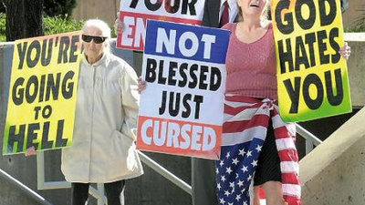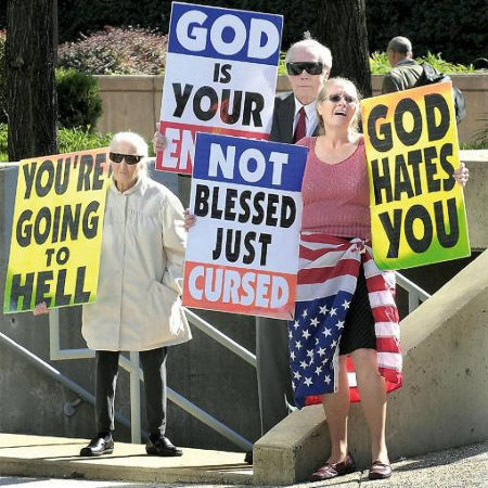 Westboro Baptist Church has held up signs at the funerals of fallen soldiers, saying "Thank God for IEDs," "Pray for More Dead Soldiers" and "God Killed Your Son." Before the families of victims of September 11th, they held up signs saying "Thank God for 9/11" and "God Hates America." Westboro has picketed the funerals of hate crime victims with placards reading "God Wants Your Son Dead" and "God Hates Fags."
