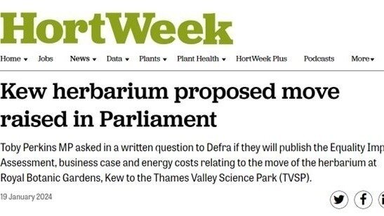 A series of five critical questions were made in the House of Commons about the proposed move to the government’s DEFRA team (Kew’s trustees are appointed by DEFRA). The questions were fired off by the shadow DEFRA team, likely to be the new government before the end of 2024. Presented by Toby Perkins MP, the questions from the opposition clearly signal concerns about the plan, estimated to cost the taxpayer an unnecessary £200 million, but seemingly supported by the current masters of DEFRA.