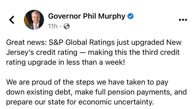 “Great news: S&P Global Ratings just upgraded New Jersey’s credit rating — making this the third credit rating upgrade in less than a week!