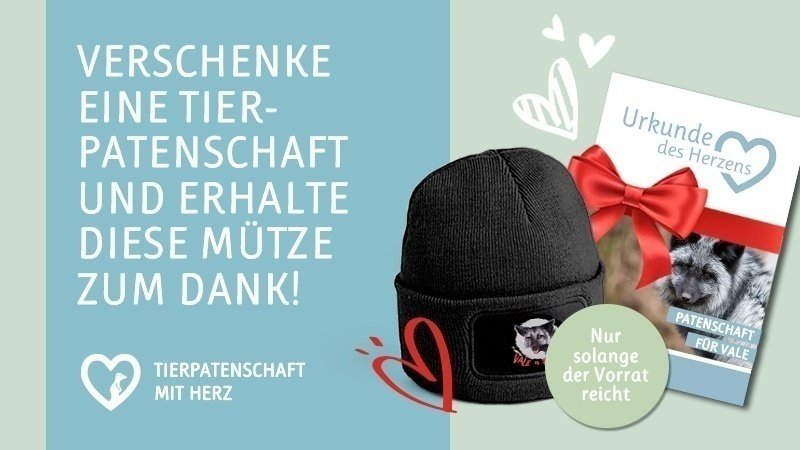 Schenke Dir oder Deinen Liebsten Tierliebe zum Tag der Liebenden. Passend zur Rettung der Füchse Onni und Vale aus einer polnischen Pelzfarm und zum Valentinstag bieten wir Dir bis zum 14.02.2022 eine tolle Aktion an: Alle, die in diesem Zeitraum eine symbolische Tierpatenschaft übernehmen oder verschenken, erhalten unsere exklusive Mütze "Vale is free", mit der Du allen zeigen kannst, dass Du gegen das Tragen von Pelzprodukten und Tierausbeutung bist!