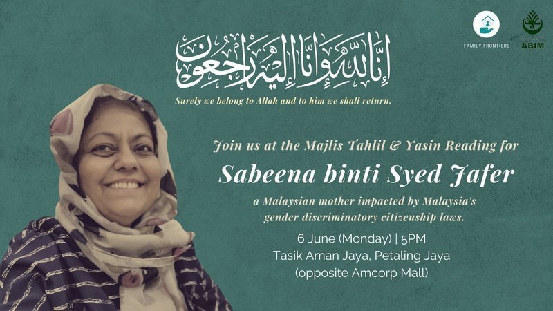 Family Frontiers, in collaboration with Angkatan Belia Islam Malaysia (ABIM), is organising a Majlis Tahlil & Bacaan Yasin for Sabeena, a Malaysian mother who was part of Family Frontiers’ Network of Impacted Malaysian Mothers. The event will be held on 6 June 2022 (Monday), 5 PM at Tasik Aman Jaya, Petaling Jaya (opposite Amcorp Mall).