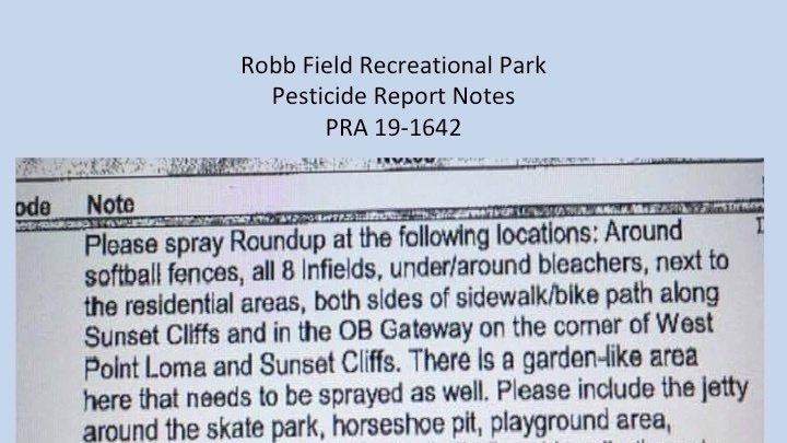 Robb Athletic Field on Bacon Street in Ocean Beach used by multiple youth sports organizations and associations, as well as adult groups, sprayed Roundup Custom and Roundup Pro Max totally 623 gallons between Jan 17 to 31, 2019 according to pesticide report.