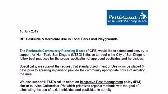 Campaign Non Toxic San Diego community members, attached is a letter of support from the Peninsula Community Planning Board in District 2. We need to keep the pressure on our elected officials. Please continue email regularly. Thank you!