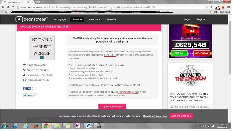 For more information, and for examples of the adverts quoted above, please see this article: http://graduatefog.co.uk/2015/4058/britains-hardest-grafter-worker-bbc-hunger-games-style-reality-tv-show-young-unemployed/
