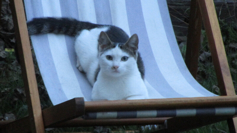 photo of a homeless Knox cat, which lives in a backyard chicken-coop, sharing the chickens' food and burrowing in the straw to sleep. The chickens are laying-well. It is a small, very scaredy-cat. Victoria's 90percent of homeless, stray cats, have no carers to contain them, or to convict. Cat curfews target renters for high fines, and rise animal deaths.