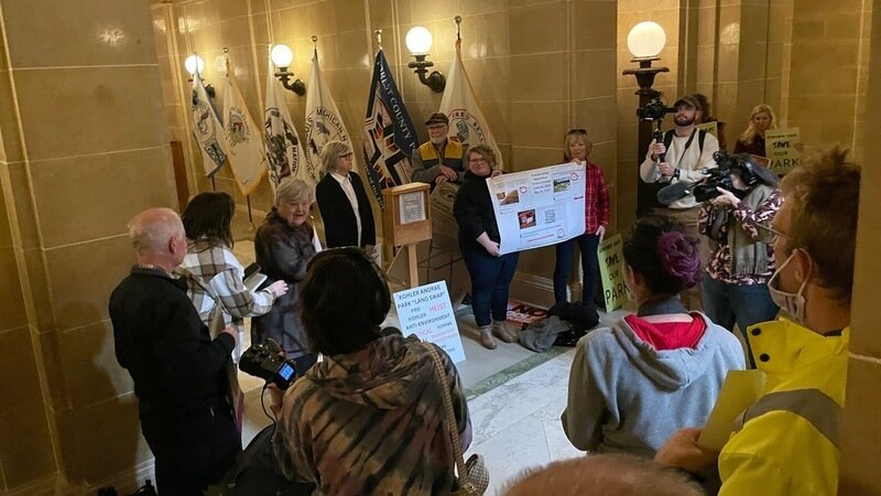 The roar of Save Our Parks!! Stop the Swap!! chants filled the Capitol Thursday, Nov. 16, as Wisconsin State Park lovers, joined FBRF and environmental groups urging Gov. Evers to send the Land Exchange Agreement giving KASP acres to a private company to use for its own profit back to the Natural resources Board to review and nullify. The agreement signed by Scott Walker, DNR and the Kohler Company was based on illegal actions by the NRB and ignored DNR procedures. FBRF contends that letting this agreement stand with no time limit, could invite sell offs of our state park lands by future administrations.