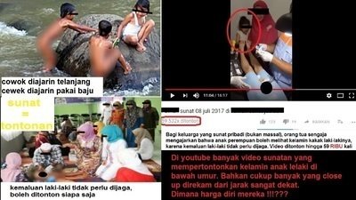 Banyak orang menuduh bahwa para wanita tidak menjaga auratnya karena pengaruh budaya luar negeri. Tetapi sebaliknya, para orangtua DI DALAM NEGERI INDONESIA sengaja mengajarkan budaya tidak tahu malu kepada anak laki-laki mereka sendiri. Bahkan sering anak lelaki yang sedang telanjang difoto atau divideokan oleh orang tua mereka sendiri lalu di-upload dan bebas dilihat puluhan ribu kali di media sosial. Contoh saat anak laki-laki sunat atau mandi/berenang (silahkan lihat foto bukti di atas).