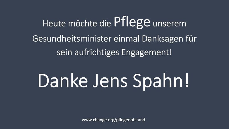 Heute möchten wir unserem Bundesgesundheitsminister Jens Spahn (CDU) einmal herzlichen Dank sagen im Namen aller Pflegenden: Herzlichen Dank Herr Spahn für Ihre herausragenden Leistungen in der Gesundheitspolitik – insbesondere für Ihr unermüdliches Engagement bei der Bekämpfung des Pflegenotstands.