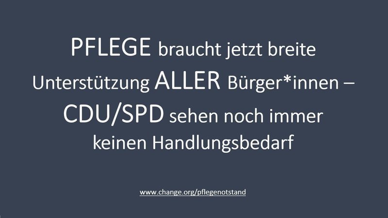 Wir hoffen, dass der Druck auf die Bundesregierung wegen der anstehenden Bundestagswahlen entsprechend wächst und sich CDU und SPD vielleicht einmal aus menschlicher Überzeugung heraus für ernstzunehmende deutlich spürbare Verbesserungen der Bedingungen in der Pflege einsetzen – und wenn nicht aus menschlicher Überzeugung heraus, dann für die potentiellen Wählerstimmen.