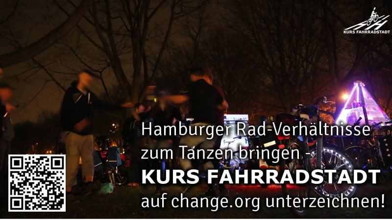 Jede einzelne dieser Aktionen ist ein wichtiger Baustein für eine bessere, lebenswertere Zukunft in dieser Stadt. Zusammengenommen braut sich endlich auch in Hamburg etwas zusammen, was durchaus das Zeug hat, auch unsere Stadt gehörig aufzuwirbeln und frischen Wind fürs Rad, für Fußgänger, für saubere Luft, weniger Autoverkehr und mehr Lebensfreude zu bringen. Deshalb zuletzt noch einmal die Bitte, euren Freunden, KollegInnen und Bekannten vielleicht den Tipp zu geben, doch einmal bei KURS FAHRRADSTADT vorbeizuschauen und ebenfalls zu unterzeichnen.