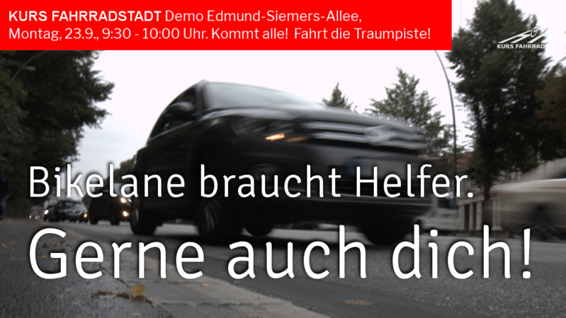 Für ein gutes Gelingen - wir haben nur eine halbe Stunde Zeit! - (9:30 - 10:00) benötigen wir noch ein paar Leute, die Lust haben, uns ein wenig mitzuhelfen. Alle Infos für Demo-Helfende haben wir hier zusammengetragen: https://kursfahrradstadt.wordpress.com/helfen-auf-der-edmund-siemers-allee/