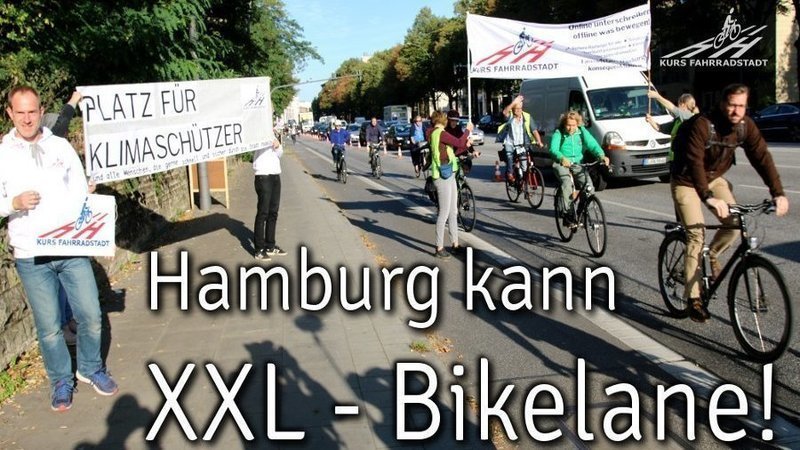 Die stark befahrene Edmund-Siemers-Allee bekam für eine halbe Stunde ihre von uns versprochene XXL-Bikelane! Das alles bei bestem Wetter, bester Laune und vielen glücklichen Fahrradfahrenden, die hier wenigstens einmal in die City radeln konnten, ohne dass die Angst im Nacken sitzt sondern dafür mit so viel Platz, dass es eine reine Freude war.