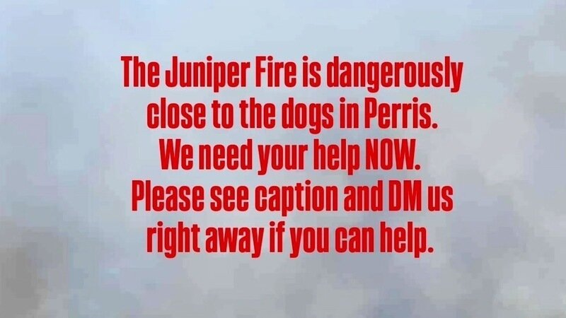 The Juniper Fire is dangerously close to the dogs in Perris. They are next to evacuate. We have BEGGED and BEGGED for fosters and help for them since last year and nothing. But today we truly need people to step up to help. This is a life and death situation. We need foster homes (even temp) for them asap. And we need drivers to drive them out of the area asap. We also need someone to drive supplies and food from 29 Palms down there. PLEASE if you can help DM us right away. If you cannot foster or transport, donations are extremely helpful too. We will figure something out one way or another but we can't do it without your help. Please DM us if you can help in any way.