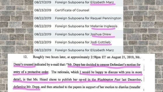 "Johnny Depp has decided to oppose Defendant's (Heard) motion for entry of a protective order" and has sent subpoenas to Heard's friends as Raquel Pennington, Elizabeth Marz, Joshua Drew, Melanie Inglessis (her make up artist) and Jodi Gottlieb. We'll see what they have to say.. (see picture above)