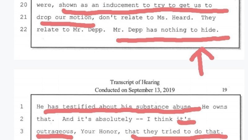 "Your Honor, the photographs that were, shown as an inducement to try to get us to drop our motion, don’t relate to Ms. Heard. They relate to Mr. Depp. Mr. Depp has nothing to hide. He has testified about his substance abuse. He owns that."