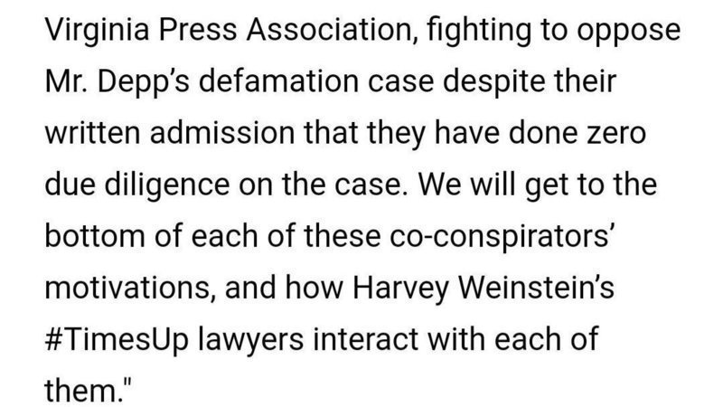 "Today, Ms. Heard added the Virginia Press Association, fighting to oppose Mr. Depp’s defamation case despite their written admission that they have done zero due diligence on the case. We will get to the bottom of each of these co-conspirators’ motivations, and how Harvey Weinstein’s #TimesUp lawyers interact with each of them."