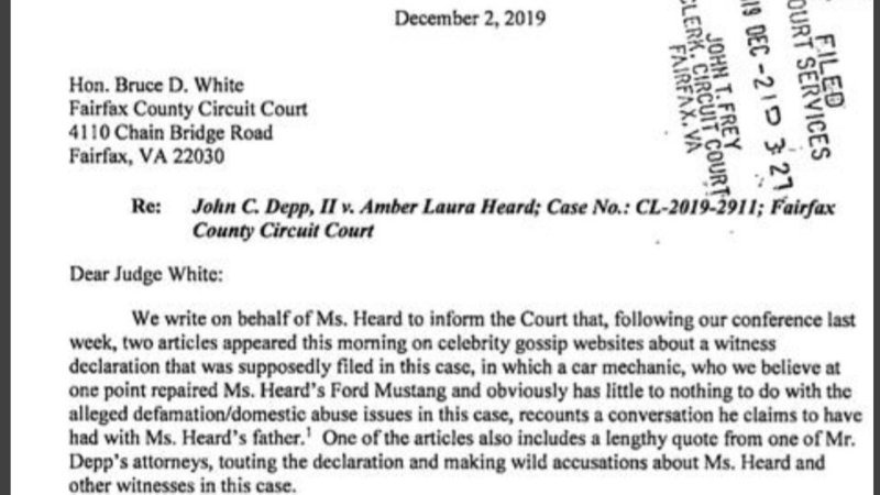 We write on behalf of Mr Heard to inform the Court that --- two articles appeared this morning on celebrity gossip websites (---> see the previously update, news from The Blast) about a witness declaration that was supposedly filed in this case ----and obviously has little to nothing to do with the alleged defamation/domestic abuse issues in this case, recounts a conversation he claims to have had with Ms Heard's father.