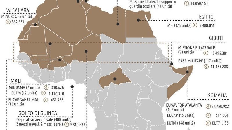 A queste ne sono state aggiunte alcune nuove: l’Operazione militare dell’Unione europea nel Mediterraneo, formalmente per «prevenire il traffico di armi in Libia»; la Missione dell’Unione europea di «appoggio all’apparato di sicurezza in Iraq»; la Missione Nato di potenziamento del sostegno a paesi situati sul Fianco Sud dell’Alleanza.