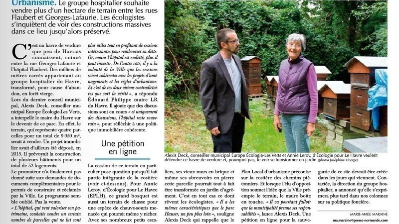 Le groupe hospitalier havrais (GHH) cherche à vendre des parcelles arborées au nord du site Flaubert, un bel endroit boisé avec de vieux escaliers, des serres anciennes et surtout une riche biodiversité. Au pied du Funiculaire et en contrebas de la rue Georges Lafaurie, cet havre de verdure est menacé par l'apathie de la mairie et l'appétit des promoteurs immobiliers. Une demande de permis de construire a déjà été déposée, heureusement classée sans suite.