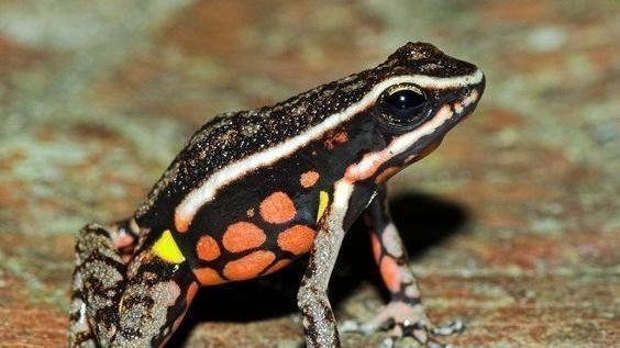 ~ Ameerega picta ou grenouille venimeuse à pattes tachetées : la grenouille venimeuse à pattes tachetées est présente en Bolivie, Pérou, Colombie, Brésil et Venezuela à des altitudes comprises entre 200 et 1200 m. Cet amphibien a une population importante. A certains endroits, leur nombre diminue en raison des activités humaines. Ameerega picta est menacée par le commerce international d'animaux de compagnie. Malgré la présence de ces animaux dans des milieux protégés, l'UICN liste cet amphibien dans la catégorie préoccupation mineure. Elle est particulièrement menacée au Venezuela car sa population est isolée.