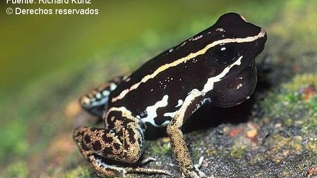 ~ Phyllobates bicolore ou grenouille poison Dart à pattes noires : il vit en Colombie proche de l'océan Pacifique. Il est présent dans les milieux humides boisés dans les contrées du Cauca, de Choco, du Risaralda et de Valle Del Cauca à des altitudes comprises entre 400 et 1500 m. Le mâle et la femelle ont des dimensions différentes (lui mesure entre 32 et 40 mm, elle mesure entre 35 et 43 mm). Son habitat est estimé à environ 20 000 km carrés mais il continue à diminuer à cause de la déforestation. Ils sont menacés par l'agriculture intensive, l'exploitation minière, la présence d'espèces envahissantes, la pollution et le commerce des animaux de compagnie. Cet amphibien est présent dans une zone protégée : le parc National de Tatama. Il devient nécessaire d'avoir des informations complémentaires sur ce spécimen.