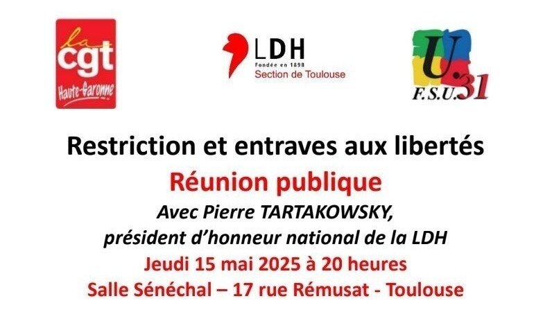 La LDH, la CGT et la FSU invitent Pierre TARTAKOWSKY, président d’honneur national de la LDH, pour une réunion publique sur le thème « Restriction et entraves aux libertés » le jeudi 15 mai à 20 heures. Cette réunion se déroulera à la salle Sénéchal, 17 rue Rémusat à Toulouse.