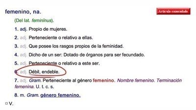 En pleno siglo XXI es una verguenza que la Real Academia Española (www.RAE.es) incluya en la definición de 'femenino,-na' una acepción que define lo feminino como 'Débil, endeble'. Así, exigimos que los académicos y académicas -hombres en su gran mayoría- cambien esto en favor de la igualdad.