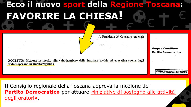 Mercoledì 18 maggio il Gruppo del Partito Democratico in RegioneToscana ha presentato una mozione per valorizzare la «funzione sociale ed educativa svolta dagli oratori operanti in ambito regionale» in virtù del principio di sussidiarietà. Una mozione «per quello che hanno rappresentato e rappresentano tutt’oggi gli oratori nell’educazione e nella promozione dello sport, dell’attività di solidarietà e nella possibilità di praticare attività ricreative di vario genere» riferisce il Consigliere Nicola Ciolini (PD), un campione di laicità che aveva già dato prova di sé il 3 maggio scorso partecipando alla processione di Montemurlo assieme al Presidente del Consiglio regionale toscano Eugenio Giani.