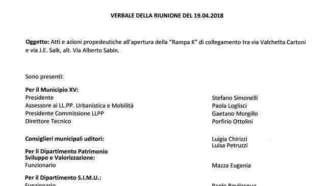 Il 19 Aprile si è svolta una riunione, convocata dall'Assessore ai lavori pubblici e urbanistica del Municipio XV, avente come oggetto "Atti e azioni propedeutiche all'apertura della Rampa K di collegamento tra Via Valchetta Cartoni e Via Salk".