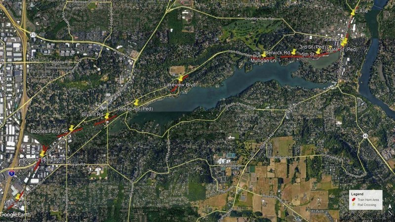 Take a look at this picture to see all crossings included in our proposal. In addition, the red lines indicate the zones in which the trains are currently required to blow their horns. A successful implementation of a RRQZ would eliminate these zones.... imagine how peaceful Lake Oswego would be?!