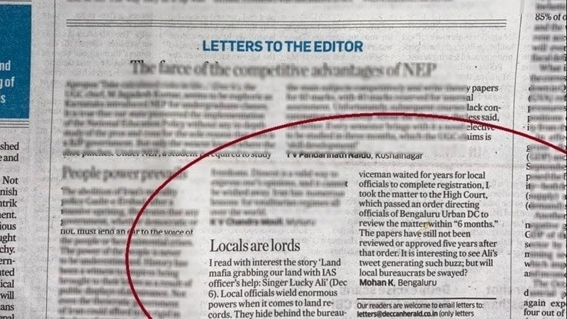 There was another article in Deccan Herald about Singer Lucky Ali accusing local IAS officer of colluding with those encroaching his land. My letter's to the editor of Deccan Herald published in the paper today.