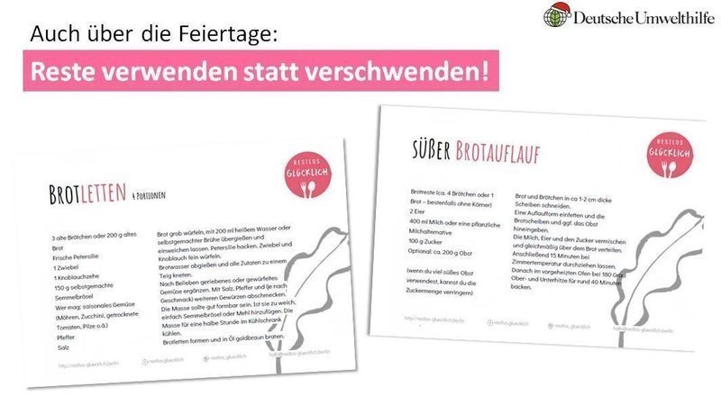 Vor allem über Weihnachten und Silvester wird bei vielen geschlemmt, was das Zeug hält. Das drei oder vier Gänge Menü mit Weihnachtsbraten, Dessert und Co. gehört bei zahlreichen Menschen zur Tradition und darf auch in diesem Jahr nicht fehlen. Die Gefahr, dass massenweise Lebensmittel in der Tonne landen ist gerade über die Feiertage daher besonders groß. Unser Petitionsunterstützer RESTLOS GLÜCKLICH hat eine praktische Liste mit lauter Reste-Rezepten zusammengestellt, mit denen man ganz einfach wertvolle Lebensmittel vor der Tonne bewahren kann. Zwei Rezepte für die Verwendung von altem Brot stellen wir euch hier zur Verfügung: