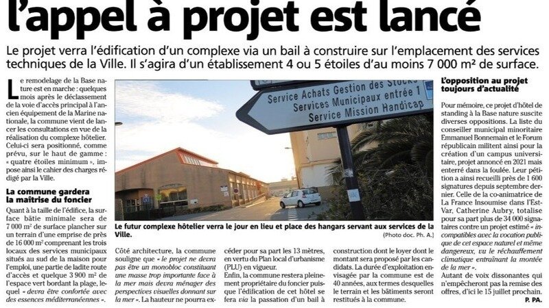 Un hôtel de 7 000 m2 sur la base nature : le projet insensé continue ! Faisant fi des oppositions, des critiques, la municipalité de Fréjus s'entête. Il veut défigurer à jamais ce magnifique espace naturel, juste pour l'argent. Comme si Fréjus avait besoin d'un établissement de luxe. Comme s'il ne sera pas situé près de la mer, qui monte, monte...Comme si cette espace n'était pas voué, par essence, aux sports, aux loisirs, à la détente....