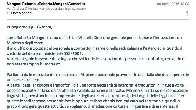 Per questo, convinto della fondatezza degli argomenti sollevati da questa petizione, vista la forte adesione che questa ha riscosso, chiederemo al Parlamento e al Governo la modifica dell'Art. 155 del DPR 18/1967 affinché per il ruolo di interprete/traduttore a contare siano, come avviene per altre Ambasciate straniere nel mondo (si veda il recente bando dell'Ambasciata USA a Parigi) i titoli, la capacità di interpretare/tradurre unita la conoscenza della lingua e all'esperienza lavorativa, con un punto in più per la conoscenza della cultura e degli usi del paese.