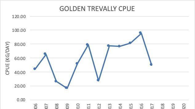 The 3 key parameters of licences, catch and effort are all on a downward trend. While the overall CPUE appears to remain steady there has been a marked decline in Golden Trevally commercial catch since 2016. These parameters suggest that the overall fishery here in Hervey Bay is in decline....