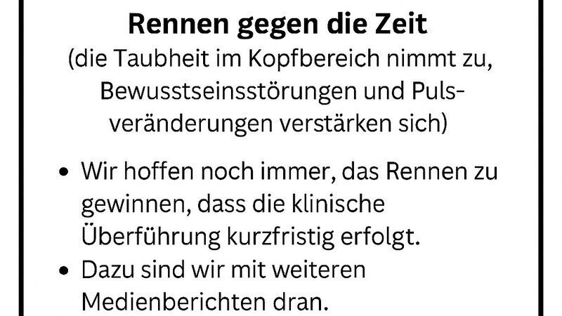 Sobald wir konkrete Zahlen zum Kostenrahmen vorliegen haben, werden wir diese transparent teilen. Schon jetzt bitten wir euch: Unterstützt uns nach Möglichkeit auch finanziell – jeder Beitrag, klein oder groß, kann entscheidend sein, damit unser Vater eine Chance bekommt, lebend aus dieser Situation herauszukommen.